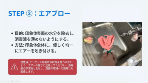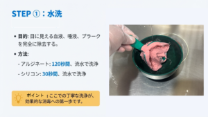 ⽇本⻭科補綴⻭科学会によると、アルジネート印象材は流水下で120秒、シリコン印象材は30秒の洗浄が必要とされています。