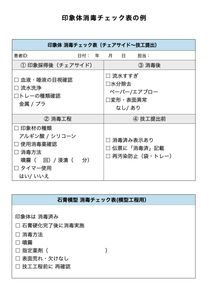 双方での消毒が前提です。印象体・模型は、輸送中、開封時、保管中にも再汚染の可能性があります。そのため、⻭科医院と技⼯所の双方で消毒を⾏う「⼆重管理」が感染管理の基本です。消毒済み表⽰(ラベル・伝票記載)も有効です。