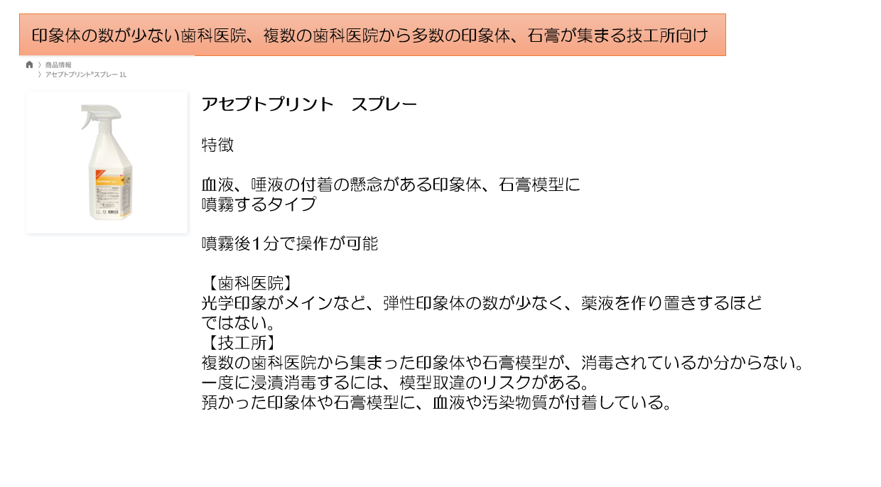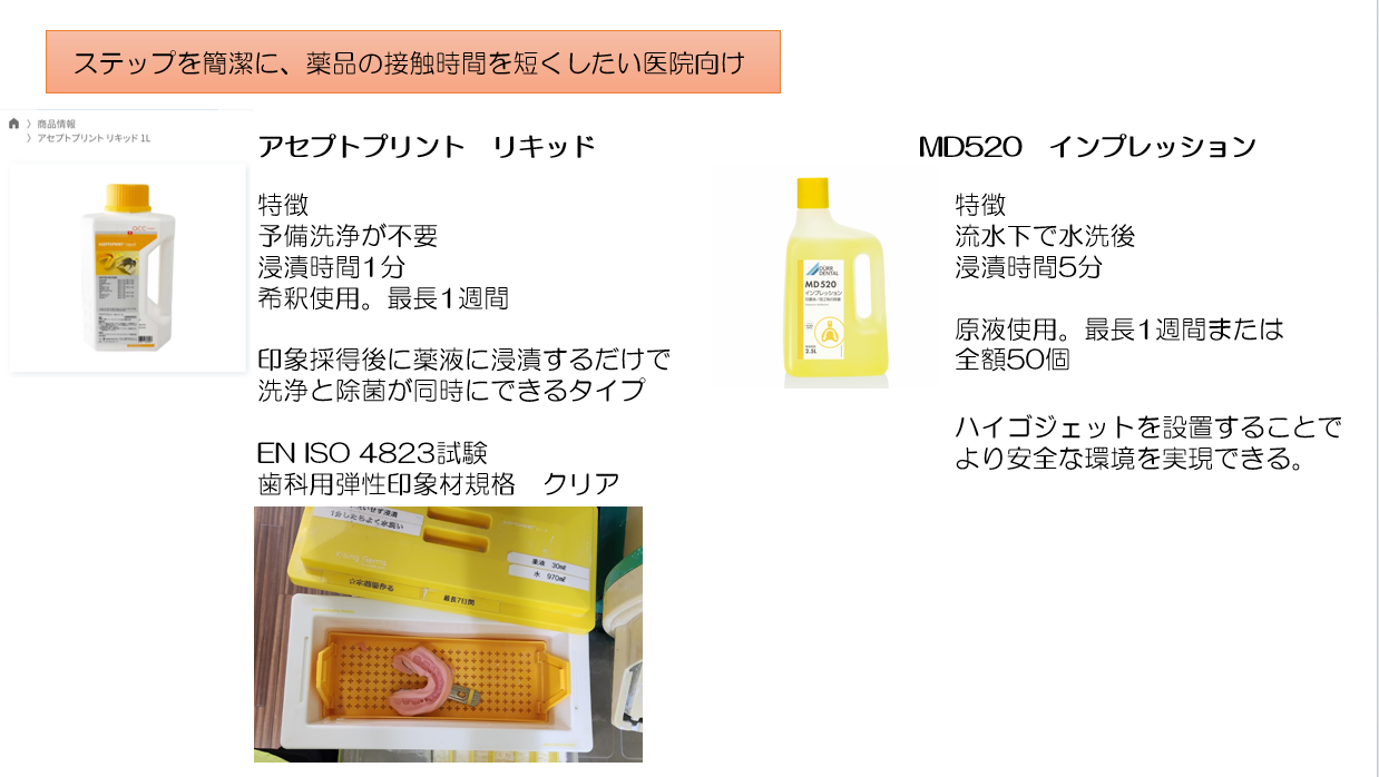 アセプトプリント、MD520インプレッションについては⽯膏模型、バイトワックス、補綴物、義⻭にも使⽤可能です。それでも、「薬剤による⼨法変化」を懸念し消毒に消極的な⻭科医師も少なくありません。成果が⽬にみえにくく、「試す」ことが難しいことから消毒そのものを⾏っていない医院が存在するのも確かです。
