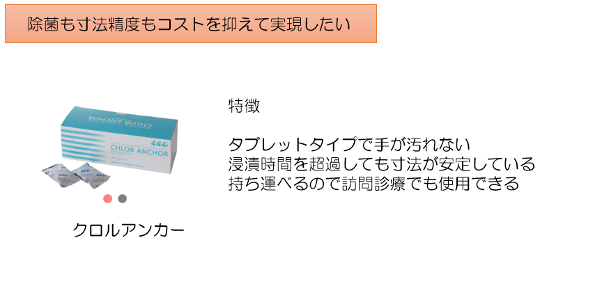 以上の推奨⼿順を実践するには、マンパワー、時間、スペースの確保が必要です。この問題に対応するため、スプレー式や短時間浸漬型の除菌剤が登場しています。また、⼨法変化の影響を考えるなら、⽯膏注入までのステップは少ないほうがいいと思われます。精度に影響を及ぼさないことを実証済の製品もあり、実際に⻭科医院や⻭科技⼯所で使⽤されている薬剤の⼀例を挙げます。
